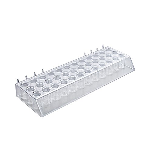 This 36 slot display tray holds mascara tubes, lipstick tubes, lipgloss bottles, mod battery, e-juice, e-cig, vapor products and more. This molded acrylic display tray measures 13″W x 4″D x 1.5″H. This tray features ROUND shaped holes that measure .625″diameter. Sold in cases of 2 13″W x 4″D x 1.5″H. Use this tray on pegboard or slatwall. Item Id: 85 – 225523
