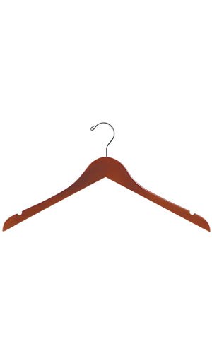 Available in a rich cherry color, these 17″ dress hangers will complement any size or style garment with a warm feeling of nobility. Additionally, each hanger features a metal swivel hook for added durability. The notches on the hanger will help to securely fasten the clothing for an appealing drape. Sold in cases of 50, the wholesale wood hangers are in stock and available for immediate shipment.Sold in Case of 50. Cherry wood finish with Heavy duty silver metal hook. 17″ dress hanger. Item Id: 85-25250