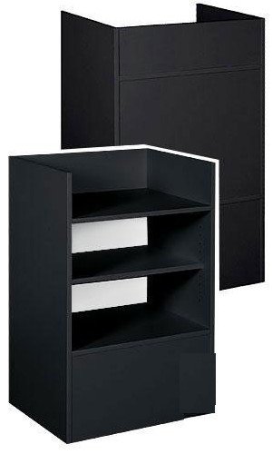The Well-Top register stand not only offers a capable display for your cash register or computer screen, but it also features adjustable rear storage for personal goods, tools, or store essentials. Finished in black low pressure melamine laminate, the register stand also features a 3/4″ slab construction. Overall, the stand measures 38″H x 18″D x 24″L. Create a custom built-in look, completely modernizing your store’s showroom floor. Ready to assemble and available for immediate shipment.Overall Size: 38″H x 18″D x 24″L,Black Melamine Finish Ready To Assemble,Adjustable rear storage shelf. Item Id : 85-65654