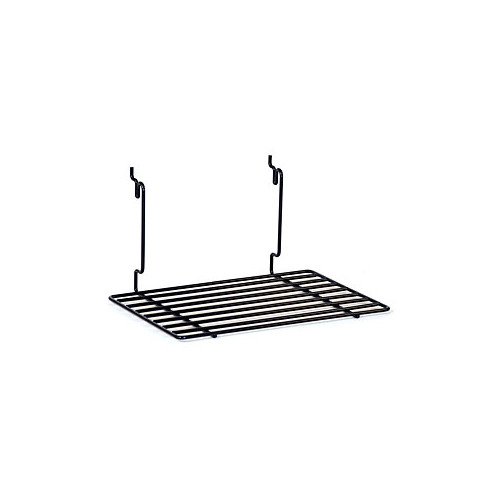 Flat Multi Use Shelf. Wire shelf that displays items on parallel wires with dimensions 12″w x 8″d. Black Fits slatwall, grid, pegboard.Displays items on parallel wires. Sold in cases of 8.Item id: 85-03064