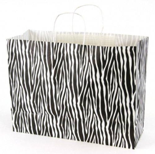 Our Large Zebra Skin Kraft bags are made of 100% recyclable 70 lb Kraft paper and measure 16″ x 6″ x 12″ makes them the perfect bag for your store. With their classic design, our Kraft bags are the perfect bag for any small store or boutique and can also make the perfect gift bags or jewelry bags. These bags are extremely durable and are supported by two super durable twisted paper handles.Sold in cases of 100. Case of 100, 16″ x 6″ x 12″ – (Vogue), Outside Color/Pattern – Zebra Skin, Inside Color – White, 70# Kraft Paper, Black/Twisted Paper Handle, 85-43-033
