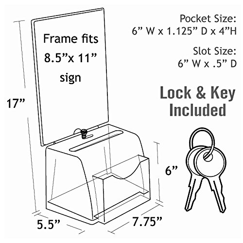 Advertise contest prizes or rules in the attached frame. The security lock keeps donations and information safe in box. The lottery box is 7.75″ wide x 5.5″ deep x 6″ high with an attached 11″ high sign frame for an overall height of 17″. The featured sign frame is 8.5″ W x 11″ H and has a side load design for easy insertion of printed material.The pocket in the front is 6″w x 1.125″d x 4″h.Slot size is 6.375″w x .5″d. Clear plastic suggestion box has many uses: use as a contest entry box, drop box, lottery box, lead box to collect sales leads, or donation box. Box is 7.75″W x 5.5″D x 6″H, Attached 11″H sign frame , Overall height: 17″, Featured sign frame: 8.5″W x 11″H, Side load design, Slot Size: 6.375″W x 0.5″D, Pocket Size: 6″W x 1.125″D x 4″H , Security lock , 85-206009