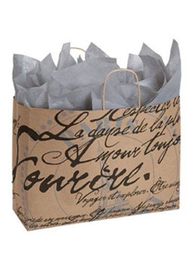 This kraft paper bag has beautiful French script printed in bold black lettering, with theEiffel Tower in the background. Add a touch of international flair to your store with our Paris Script Paper Shoppers! Sold in cases of 100. 16 “x 6 ” x 12 ” (Vogue), Kraft Interior Color, 100% Recyclable, Tissue Paper Sold Separately, 85-92738