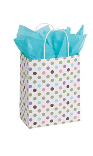 These bags have a white background featuring pink, purple, chocolate and green polkadots for easy coordination with our tissue paper. Add a colorful style to your store with our Playful Polkadot Paper shoppers! Sold in cases of 100. 8″ x 4 ½” x 10 ¼” (Cub), White Interior Color, 100% Recyclable, Tissue Paper Sold Separately , 85-92731