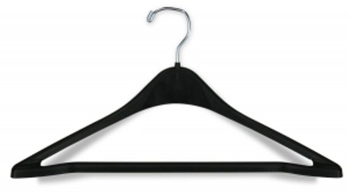 Sold in a pack of 100, these contoured black plastic suit hangers feature a bright chrome-plated hook that swivels and a shape that is contoured to preserve a garment’s natural shape. Manufactured with extra ribbing for strength and durability, our contoured clothing hangers are an essential tool for selling coats, suits, pants, dresses, shirts, and blouses. Size: 17″ Pack of 100, Chrome-plated swivel hook, 17″, Contoured shape, 85-58-158
