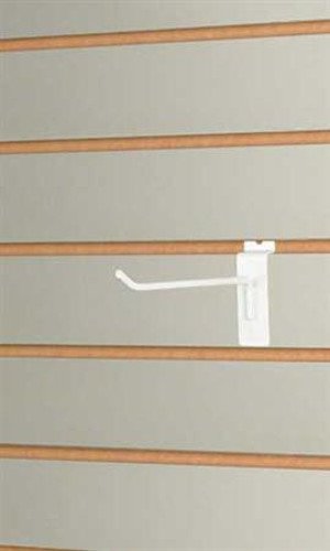 Maximize your wall space using the 4″ White Slatwall hooks ! The Slatwall hook will help to maximize the space and usability of your Slatwall display, because it expands outward with a 4″ reach, allowing you to stock smaller products in a neat and orderly fashion. The white finish will match almost any color slatwall, keeping your display setting subtle and attractive. With the lowest price guaranteed, the 4″ slatwall hooks are a must have for any retailer. In stock and available for immediate shipment.Sold in cases of 100 Sold in cases of 100, Use with 3″ on center Slatwall & Slat Grid Panels, 6mm Diameter Tubing, Measures 4″ in length, Integrated Mounting Bracket, 8545302