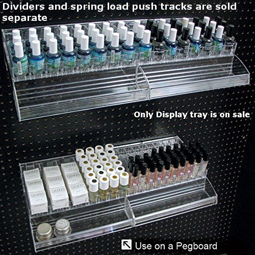 This modular cosmetic tray is 12″ W x 11.75″ D x 3.375″ H. These trays can connect to each other to create a customized cosmetic display of any size. There are three interchangeable dividers that can be used in these trays. The end and center dividers are both 1.125″ W x 7.5″ D. The other divider is a spring -loaded pusher track. It is 0.75″ W and it has 6.75″ of usable space. These spring-loaded tracks have a panel that is 2.25″ H in the front (that is pushed back when the track is filled with product). These spring-loaded holders are perfect to hold mascara, nail polish, or any other small item. C-channel options are available. Includes two U-Hooks. 12″ W x 11.75″ D x 3.375″ H Three interchangeable dividers , Spring -loaded pusher track, C-channel options are available, 2 metal U-hooks, The dividers and spring load push tracks are sold separate. Sold in 2 Quantities, Item Id: 85-225840