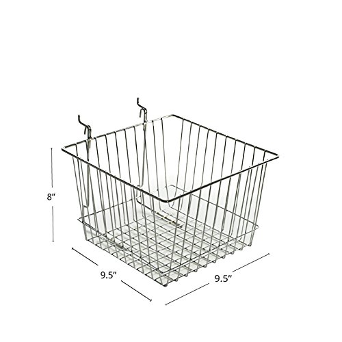 8″H Chrome Wire Basket. Opening measures 12″W x 12″D; Bottom measures 9.5″W x 9.5″D. For use on pegboard, slatwall or gridwall. 2 wire hooks attached for easy mounting.Sold In case of 2 12″W x 12″D Item Id: 85 – 300622