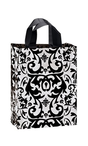 The soft frosty look of the bags adds a hint of sophistication and style at an affordable price. These 8″ x 5″ x 10″ bags feature strong handles and a hard board bottom to provide rigidity. They are an obvious choice for bridal, children’s retail and holiday sale promotions. Our black damask frosty plastic shopping bags are ideal for retail purchases, special occasions and gifts. Sold in cases of 25. 8″ x 5″ x 10″ (Cub), Low Density Polyethylene(LDPE), Thickness: 3mil, Size Does Not Include Handles, 85-92888