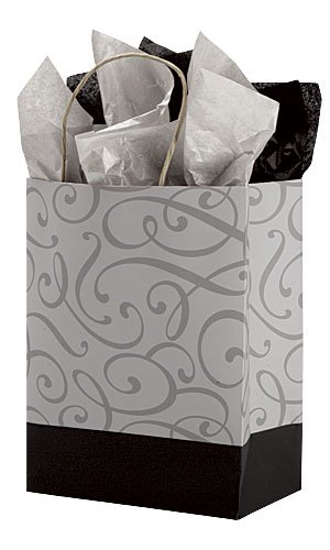 These Platinum bags feature a complex Platinum design and solid black bottom to polish off the look. Pair these bags up with our coordinating packaging options such as our tissue paper, ribbons, or bows and transform ordinary paper shoppers into elegant, classy gift bags. Your customers will love carrying out their purchases in our Black & Silver Swirl Paper Shopper. Sold in cases of 25. 8″ x 4 ½” x 10 ¼” (Cub), Kraft Interior Color, 100% Recyclable, Tissue Paper Sold Separately , 85-92794