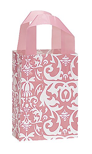 The soft pink damask style adds a hint of sophistication and style at an affordable price. These 5″ x 3″ x 7″ bags feature strong handles and a hard board bottom to provide rigidity. They are an obvious choice for bridal, children’s retail, and holiday sales promotions. Our Pink Damask frosty plastic shopping bags are ideal for retail purchases, special occasions and gifts. Sold in cases of 25. 5″ x 3″ x 7″ (Rose), Low Density Polyethylene(LDPE), Thickness: 3mil, Size Does Not Include Handles , 85-92881