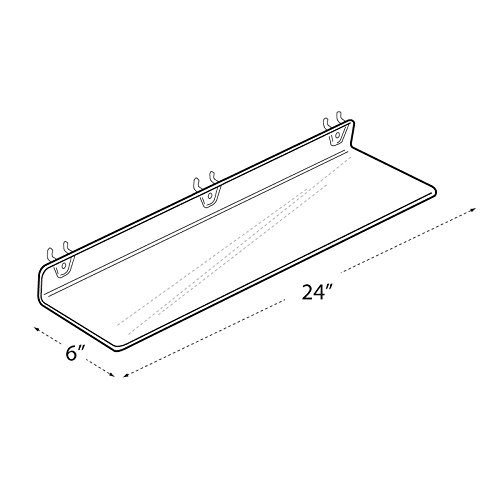 This is a Clear Acrylic Shelf that is .1875″ thick and measures 24″w x 6″d x 2″high. Two plastic hooks attached to unit so customer can mount on any pegboard or slatwall system. 24″ Wide x 2″ High x 6″ Deep , Color: Clear, Acrylic Shelf, 2 Plastic hooks attached for easy mounting, Sold in 4 Quantities, Item Id: 85-556009