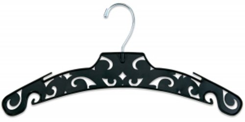 Sold in a pack of 50, these black boutique dress hangers feature a bright chrome-plated hook that swivels to direction you need. Molded from black plastic with a damask-influenced swirl detail adds a unique beauty, while the integrated garment strap hooks make these hangers perfect for selling dresses, T-shirts, and blouses. Pack of 50, Chrome-plated swivel hook, Damask-inspired swirl detail, 85-58-155