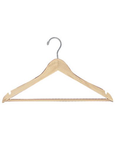It’s easy to create merchandise displays with our 17″ natural wood, all-purpose hangers. No matter what you have to hang– whether it be dresses, shirts, tanks, jackets, or pants– you can hang all garments on one style hanger. The additional wooden rod across the bottom of the hanger gives support for garments such as heavy denim, thick material dress pants, or anything you can think of that has the ability to drape! The attached silver metal hooks provide extra strength and durability. All of our wholesale wooden hangers are sold in cases of 50, are in stock, and are ready for immediate shipment. 50 hangers per case, Dress hanger with additional draping rod, 17″ all purpose notched hanger, Silver metal hooks,85-25272