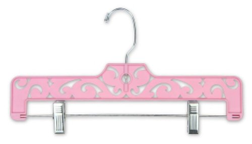 Sold in a pack of 50, these pink boutique pant and skirt hangers feature a bright chrome-plated hook that swivels to direction you need. Molded from pink plastic with a damask-influenced swirl detail adds a unique beauty, while the sturdy integrated garment clips make these the perfect hangers for pants, skirts, and shorts. Pack of 50, Chrome-plated swivel hook, Damask-inspired swirl detail, 85-58-156