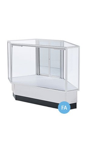 Full Vision Rear Access Corner Display Cases featuring a durable laminate exterior finish with mealmine laminated surfaces, bright white deck and doors, ships fully assembled. Satin finish, clear anodized aluminum frame extrusions, matching steel interior standards and brackets, tempered glass front, top, sides, and shelves. The Full Vision Rear Access Corner Display Case features two rows of adjustable glass shelves (one row 8″ deep and one row 10″ deep). 38″H x 20″D x 34″L Gray Rear Access Door Optional Lock, Light Kit and Mirrored Doors available (sold separately) 85-65184 Shipping notes: This item is shipped by truck. We need a phone number in order to schedule shipping. Shipping is Free to your curb. The item is brought to the edge of the truck. You would be responsible to bring the item down from edge of the truck. Most truck carriers will bring the item into your house for your for an extra fee. Please email us for details.