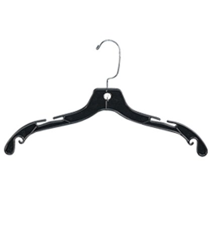 Use the Economy Plastic Dress Hangers in Black for an affordable alternative to our regular dress hangers. These economy hangers have the same great design, shape, and dimensions of our regular hangers at a more affordable price! Featuring anchored chrome swivel hooks and notched shoulders for hanging straps, these hangers are a great addition to your retail displays. The 17″ economy dress hanger will hold up to 12lbs which makes them perfect for lightweight clothing and everyday use. Sold in cases of 100 and available for immediate shipment on all orders placed before 3pm! Sold in cases of 100, Holds up to 12lbs, Color: Black, Dimensions: 17″,85-25201E