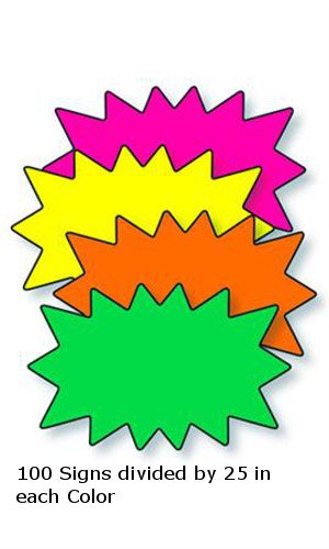 Don’t bore your customers with boring displays! Add some pop to your displays and excite your customers when you let them know about sales and specials by using these Solar Burst Rainbow Sale Cards. Measuring 11″ x 7″, these single cards are a great way to add excitement to your storefront. The Rainbow Pack consists of 100 Individual Cards: 25 of each of the four different fluorescent colors, which are green, pink, yellow, and orange. In stock and available for same day shipping if order is received by 3 PM. Pack of 100, 11″W x 7″H, 25 of each fluorescent color Yellow, Green, Pink and Orange, Single Sided, 85-15418
