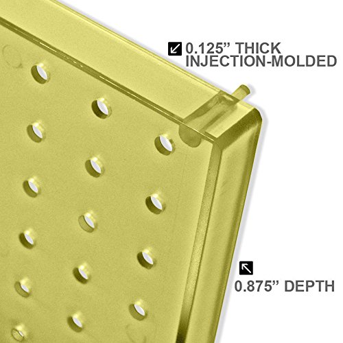 pegboard wall panel mounts to any flat surface. Pegboard panels are injection-molded creating a single plastic unit that is strong and flexible. Our pegboard panels are high quality and durable. You can use them to organize the children’s room, a hobby room, or even the garage. Our pegboards are even featured in Do it Yourself magazine (DIY magazine). This panel measures 13.5″ W x 22″ H (hardware not included). Visit our pegboard accessories section of our site for creative ideas to display and organize products. 10 color options are available. Quantity discount pricing is available. Sold in multiples of 2. 10 color options are available. Quantity discount pricing is available. Sold in multiples of 2. Pegboard holes are 1-Inch on center, Works great with line of hooks and accessories, Available colors:Almond, Black, Blue, Clear, Green, Orange, Pink, Purple, Red, Yellow and White, Made from durable plastics, 85-771322
