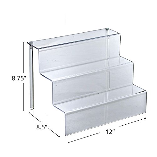 Made from clear acrylic, this three-tier step display measures 12″W x 8.5″D x 8.75″H. Each step measures 2.75″D. Azar’s step displays are great for displaying an array of products – nail polish, cell phone accessories, cards, boxed products, cosmetic creams, vapor products and so much more. Sold in lot of 4. 12″ Wide x 8.75″ High x 8.5″ Deep, 3-Tier Countertop Step Display, Clear Acrylic Construction, Item Id: 85 – 326043