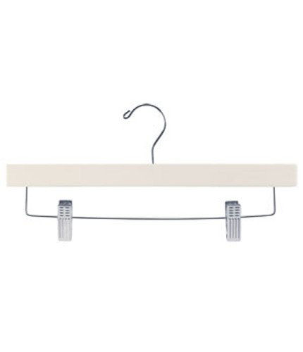 Finished with a soft ivory color, these 14″ wooden pants and skirt hangers will flatter any garment with a charming touch of purity. Featuring a silver metal hook and clips to accent the hanger bar, these hangers are strong and durable, hanging any garment neatly on merchandise displays and clothing racks. Sold in cases of 50, our wholesale ivory hangers are in stock and available for immediate shipment. Sold in Case of 50, Ivory wood finish, 14″ pant hanger, Heavy duty silver metal hook,85-25253