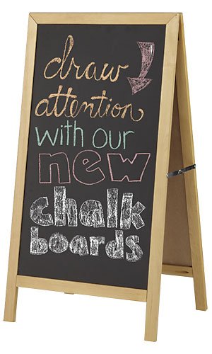 This chalkboard has a natural and contemporary look that is suitable for indoor or outdoor advertising. The 23½”W and 42½”H chalkboard comes with a box of multi colored chalk and magnetic eraser. The Wood A-Frame Chalkboard Sign is in stock and available for immediate shipment! Create fully customizable advertisements and announcements with a Wood A-Frame Chalkboard Sign. Item id:85-18326