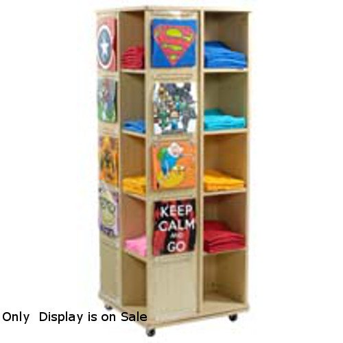 Make T-shirt shopping a breeze for your customers! This four sided rotating T-Shirt display is made with a scuff resistant melamine wood and includes casters. The Revolving display can hold up to 20 different styles with a cube on each side that measures 11 in. x 10 in. The Revolving Cube Display features a unique acrylic front to display T Shirts next to the folded product. To display product, simply unscrew acrylic front and add items then screw the acrylic front closed. Available in Black, Cherry or Maple. All orders will be processed as Color Maple as pictured in the lead photo – However this item comes in the following colors: (Maple and cherry) – Upon ordering this item please email us if want to choose a color other then Maple Laminated wood, 23 1/2 in. W x 23 1/2 in. D x 63 in. H, Available colors: Cherry and Maple, 85-20138M. Truck Shipping: This item is shipped by truck. We need a phone number in order to schedule shipping. Shipping is Free to your curb. The item is brought to the edge of the truck. You would be responsible to bring the item down from edge of the truck. Most truck carriers will bring the item into your house for your for an extra fee. Please email us for details.