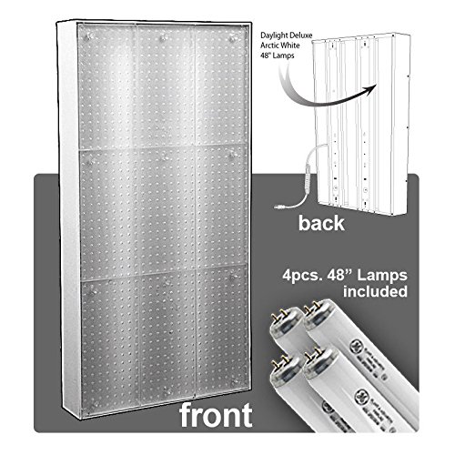 This 24×48 wall mount organizer panel mounts to any flat surface. The light box includes: (1) 24″ W x 48″ H clear pegboard panel; (1) light diffuser panel; and (4) daylight deluxe arctic white 48″ lamps, which are 32 watts each. Lamps last approximately 3 years based on 12 hours of average usage per day. Use fluorescent bulb covers to change colors of the pegboard light box. Bulb covers are available in blue, pink, purple, and yellow. ” All orders will be processed as Color Blue as pictured in the lead photo – However this item comes in the following colors: (Blue, Green, Purple, Yellow and Pink) – Upon ordering this item please email us if you want to choose a color other then Blue” Item Id: 85-700200