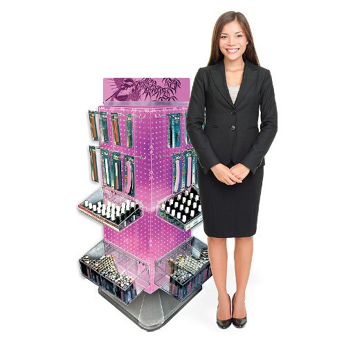 4-sided pegboard interlocking unit measures 14″ W x 14″ D x 40″ H and revolves on a 18″W x 18″D x 5″H square weighted base. Available in a variety of colors. Color options shown below. Easy to assemble (no tools required). A sign holder strip comes standard with the unit. Ships un-assembled.Once assembled, it cannot be disassembled. All orders will be processed as Color Clear as pictured in the lead photo – However this item comes in the following colors: (Almond,Black, Blue, Clear, Green, Pink, Purple, White, Yellow) – Upon ordering this item please email us if want to choose a color other then Clear.14″ W x 14″ D x 40″ H 18″W x 18″D x 5″H square weighted base Clear Available Colors: Almond,Black, Blue, Clear, Green, Pink, Purple, White, Yellow,85-701435-CLR