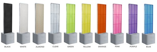 Two-sided pegboard floor display on studio base. Comes in a choice of ten colors and measures 16″ W x 60″ H. This two-sided display stands on a tall studio base. The display includes a sign holder strip. Choose to add a header card or sign holder to draw customer attention.Color: Clear All orders will be processed as Color Clear as pictured in the lead photo – However this item comes in the following colors: (Almond, Black, Blue, Clear, Green, Orange, Pink, Purple, White, Yellow) – Upon ordering this item please email us if want to choose a color other then Clear.Sold in Multiples of: 1 Material: High impact styrene Usable Pegboard Space: 16″ x 44″ up to 16″ x 54″ w/ standard 0.25″ holes Overall Height: 60″ Base Dimension: 17″W x 14.5″D x 16″H Color: Clear Available Colors: Almond, Black, Blue, Clear, Green, Orange, Pink, Purple, White, Yellow,85-700775-CLR