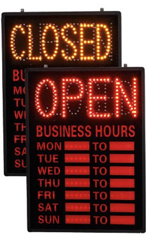 Let your customers know when you are in business with our Open/Closed LED Sign. Our LED sign will guide customers to your business. Our sign features wording that reads OPEN in orange and CLOSED in red. When the sign indicates OPEN, it cycles from stationary to progressive. The sign has space to write in your store daily business hours which will be clearly seen when the sign is illuminated. The hours can be changed anytime with a dry erase pen (included). Controllers for the sign are located on the back to indicate on/off, flash/static and speed. The overall dimensions of the sign are 16 ⅝”W x 1 ⅝” D x 23″H. 85-18339