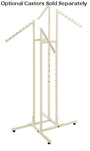 It’s easy to create attractive merchandise displays with the dynamic 4-way rack complete with a glowing, translucent opal, ivory finish. Attract customers with a central floor display and offer a fully accessible, extended supply of clothing items. This boutique rack has adjustable slanted arms that transition from 48″ to 72″ high. It visually creates a waterfall effect giving customers an easy view of all products offered. Customize your stores look with one of our four stylish finial toppers to match the Ivory finish. This fixture uses square fitting finials. Available for immediate shipping, the Ivory 4-Way Clothing Rack is a great solution for small boutiques. 48″-72″H 3″ Increments, Arms 18″L, Ivory, Adjustable Leveler Glides, Optional Casters Sold Separately, 85-60562