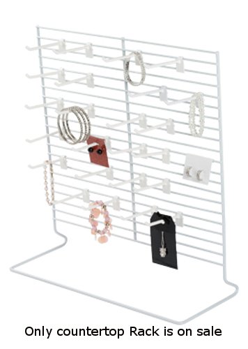 This self standing Wire Countertop Rack is perfect for any small hangable items, like jewelry, accessories, or other small products. It’s perfect for the checkout counter or to complement other merchandise and apparel on display. The countertop rack measures 18″W x 20″H and features a a durable white powder-coat epoxy finish, that won’t fade away. With twenty-four 4″L white plastic peg hooks, this stand is an essential for retailers! In stock and available for immediate shipment. White Finish. Self Supporting Metal Frame. Overall Dimension: 18″W x 20″H . Includes twenty-four 4″ White Plastic Peghooks. Item Id: 85 – 16139
