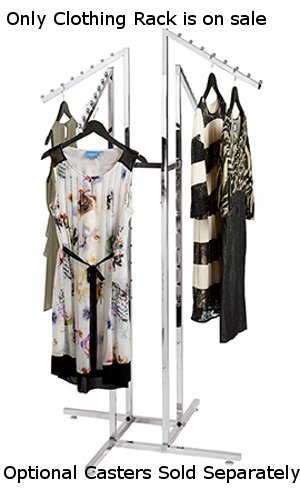 Show your customers all available merchandise options with the Chrome 4-Way Slant Clothing Racks. These garment racks are fully adjustable, with easy push buttons, in 3″ increments from 48″ to 72″ high. The four slant arms feature 8 balls each to ensure that merchandise stays in place. The chrome finish matches almost any store’s design. The 4-way rack is great for central floor displays to present all new inventory as well as all options associated with it. Also features welded end caps and adjustable leveler glides. The Chrome 4-Way clothing racks are available for immediate shipping. 48″-72″H 3″ Increments, Arms 18″L, Chrome Finish, Adjustable Leveler Glides, Optional Casters Sold Separately, 85-60104