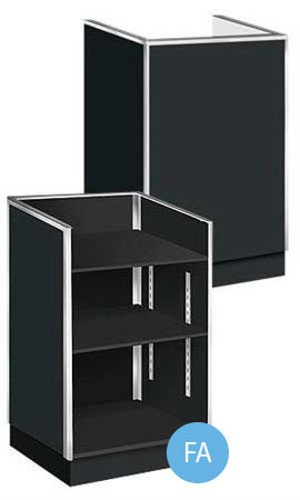 Presentation is everything. Organize your store and attract customers by tying together all of your display units to create a custom built-in design using our Metal Framed Well Top Register Stand. Created using long wearing melamine black laminate and satin finish anodized aluminum framing to complement, the panel-front well top register stand is a great place to keep your store’s cash register or computer. Featuring two adjustable rear storage shelves, the stand will hold tools, supplies and store essentials, so that your employees can serve customers quickly and efficiently. Finished on both sides. Overall dimensions include: 38″H x 20″D x 24″L. Wood crating is included in the price of the case, to ensure secure shipping. Ready to ship. Black Melamine Finish, Two adjustable rear storage shelves, Overall Size: 38″H x 20″D x 24″L, Black kick-plate, 85-65564