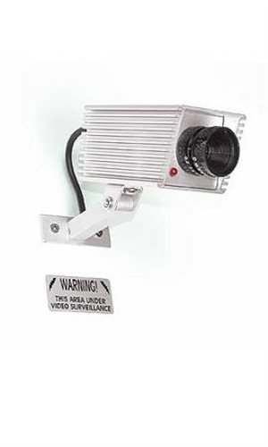 Mini Simulated Video Surveillance Camera With Red LED fits anywhere. Complete with mount, blinking red, LED light & 2 ”WARNING! THIS AREA UNDER VIDEO SURVEILLANCE” silver metallic plaques. Also features Indoor/Outdoor metal housing with mounting hardware. Light requires 2-AA batteries (not included). 4½”W x 4″D x 2¼”L, Mounting Hardware Included, Indoor/Outdoor Use, Battery Operated (not included), Sold Individually, 85-18242
