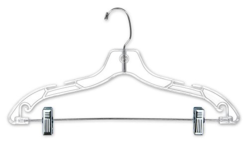 Sold in a pack of 100, these clear suit hangers feature a bright chrome-plated hook that swivels to direction you require. Molded from clear polystyrene with integrated garment strap hooks and strong padded clips, these clear plastic clothing hangers are the essential tool for selling suits, coats, dresses, slacks, pants, and shirts.Size: 17″ Pack of 100, Chrome-plated swivel hook, Strong padded clips, 17″, 85-58-167