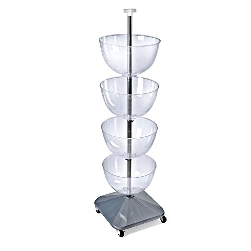 This four-tier bowl display measures 10″D and 16″ in diameter per bowl. Includes an 18″W x 18″D x 8″H wheeled plastic base. The height of each display bowl is fully adjustable with the use of the included metal support clamps. Sign holder clip included. Overall height is 63.25″. 18″ Wide x 47″ High Bowl Display, Four 10″ Deep clear plastic bowls, 8″ square base on locking casters, Sign holder clip, Item Id: 85 – 700940
